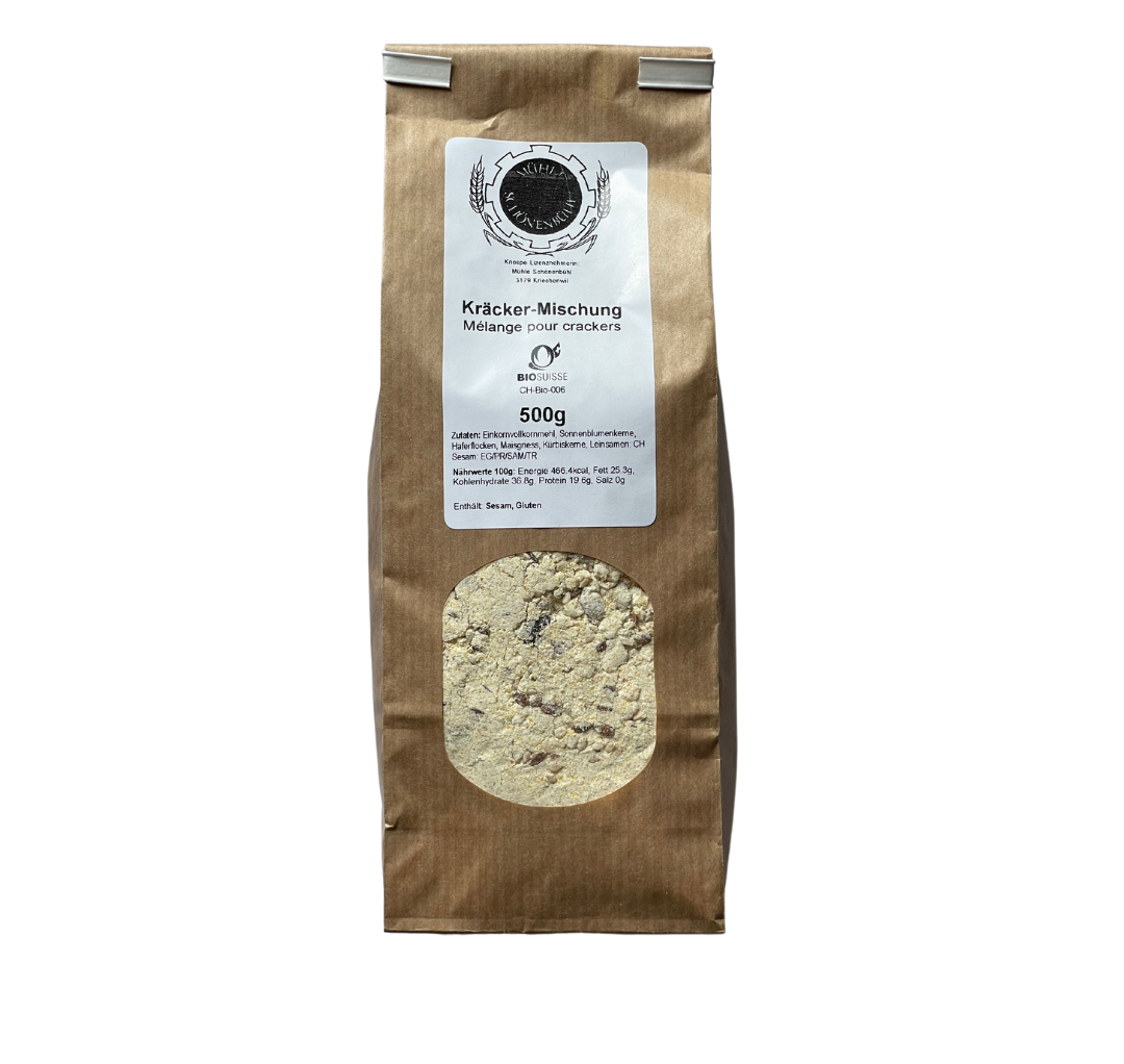 Zutaten: Einkornvollkornmehl CH, Sonnenblumenkerne CH, Haferflocken CH, Maisgriess CH, Kürbiskerne CH, Leinsamen CH, Sesam EG