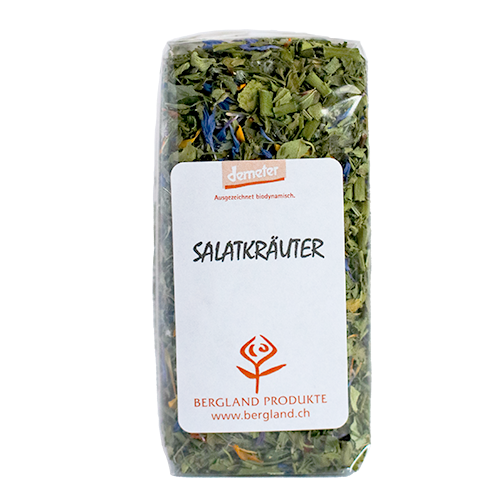 Zutaten: Petersilie, Schnittlauch, Boretsch, Dill, Oregano, Ringelblumen, Kornblumen, Kapuzinerkresse Insgesamt werden auf dem BerglandHof im Wallis etwa 250 Kräuter-Sorten angebaut, darunter viele Pro-Specie-Rara Sorten – bestäubt von Bienenvölkern der Imkerei vor Ort. Die Kräuter werden schonend getrocknet und anschliessend zu feinen und bekömmlichen Tee- und Kräutermischungen nach eigenen Rezepturen verarbeitet und abgepackt.