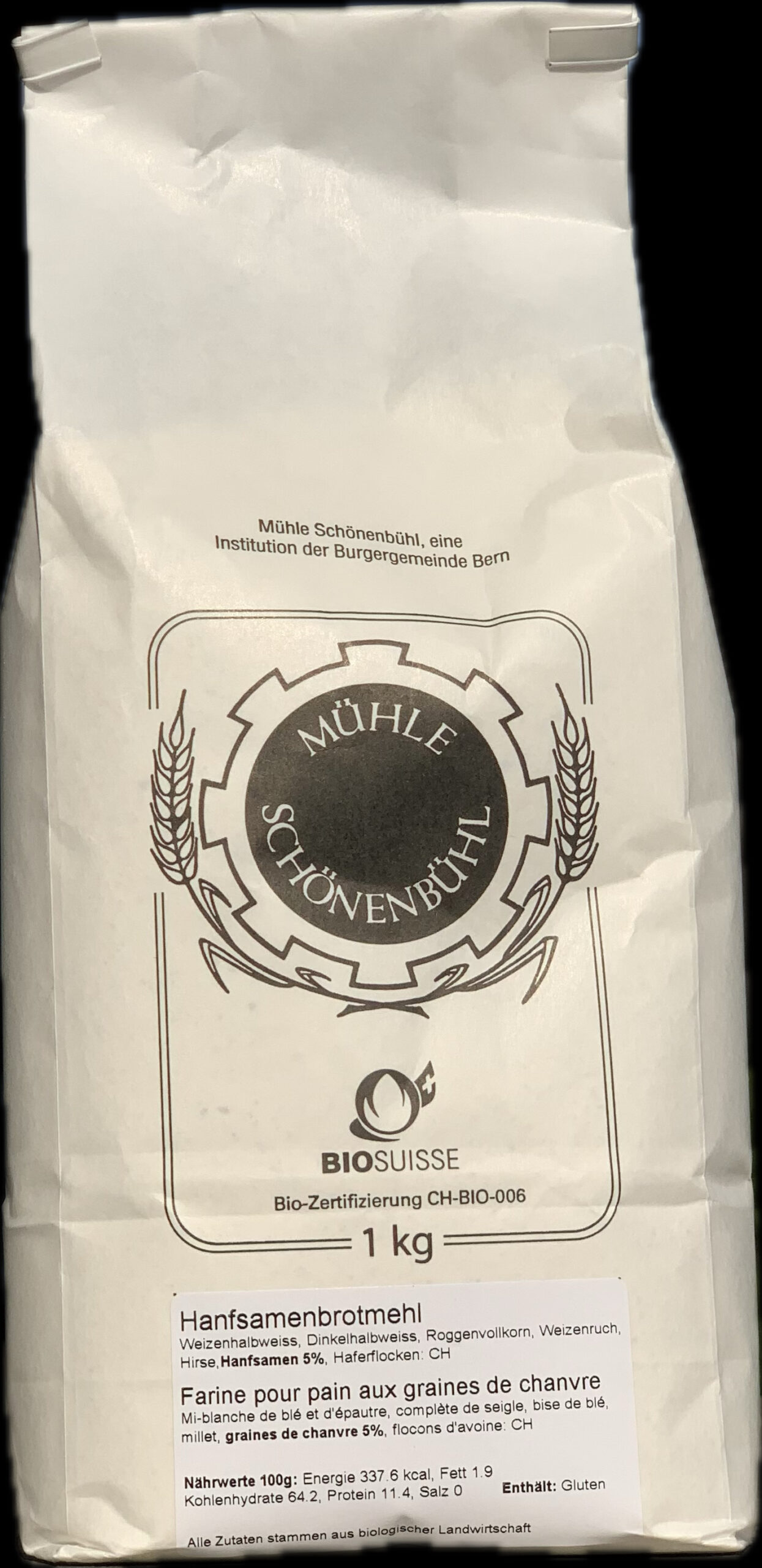 Zusammensetzung: Weizenhalbweissmehl CH, Dinkelhalbweissmehl CH, Roggenvollkorn CH, Weizenruchmehl CH, Hirse ganz CH, Hanfsamen ungeschält CH, Haferflocken fein CH, Weizennachmehl CH